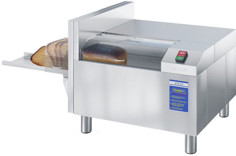 • Защитная шторка для предотвращения доступа рук в зону нарезки хлеба со стороны приемного лотка
