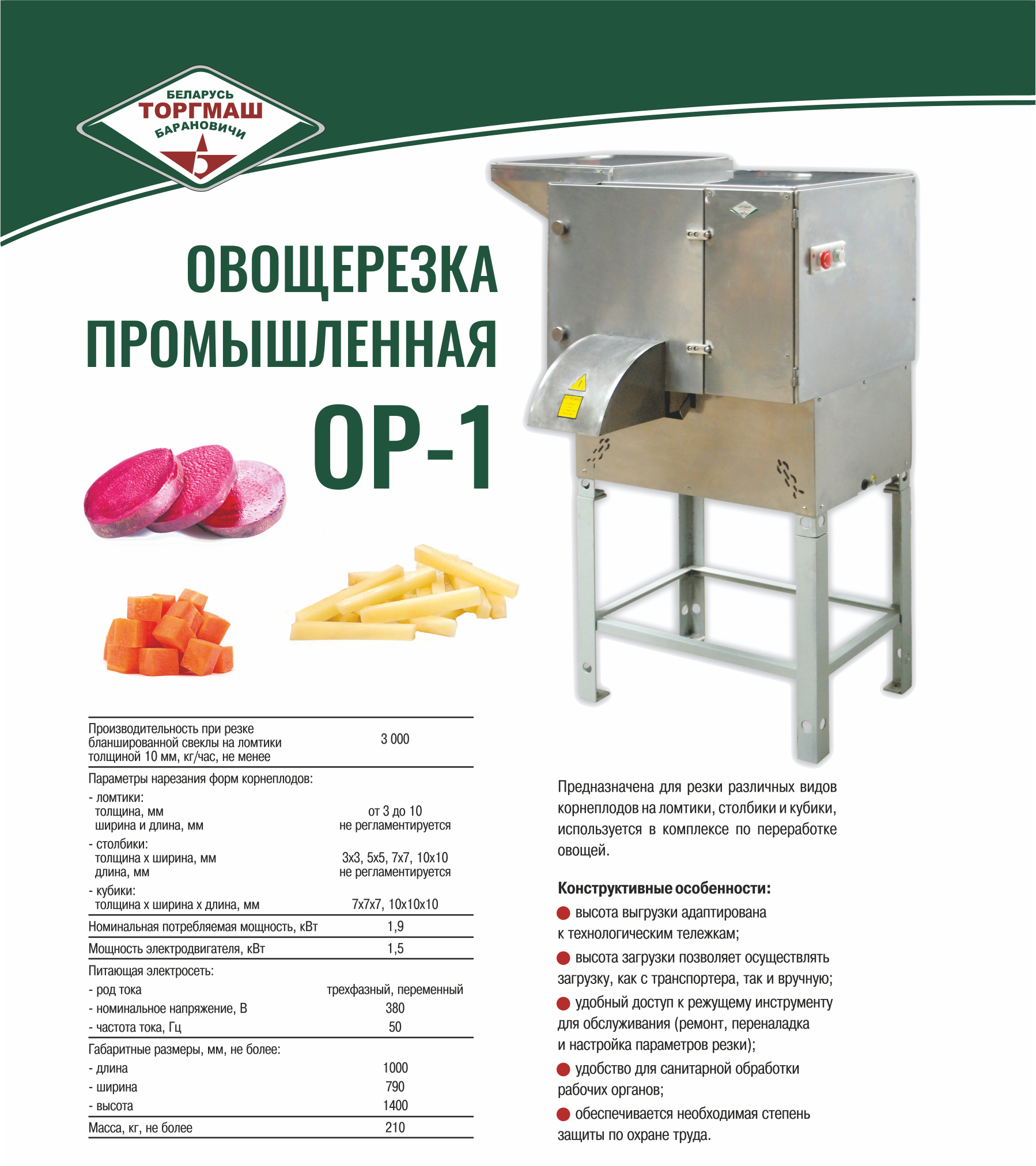 - Производительность при резке бланшированной свеклы на ломтики толщиной 10 мм: 3000 кг/ч