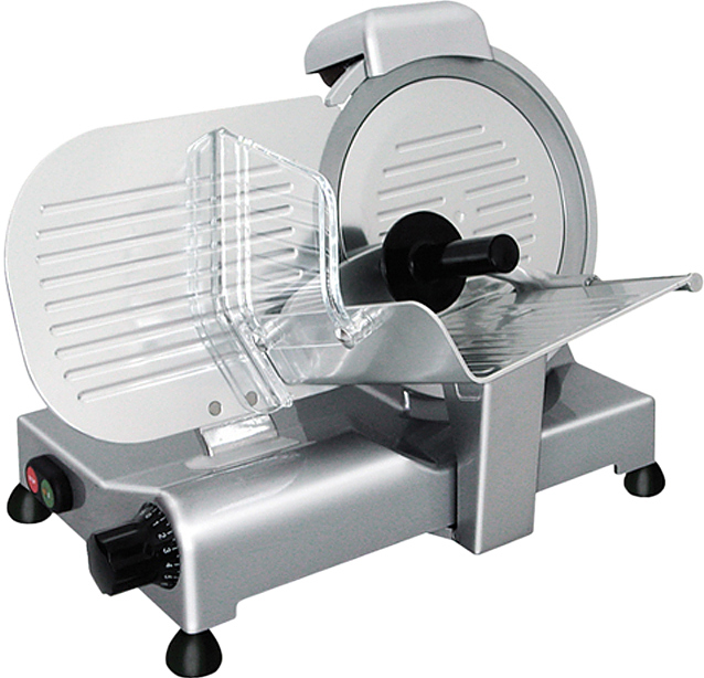 Слайсер Vortmax GSM 250 предназначен для нарезки мяса, сыра, колбасных изделий и продуктов питания на ломтики заданной толщины на предприятиях общественного питания и торговли, а также в производственных цехах, деятельность которых связана с выпуском гастрономических товаров. Модель оснащена фиксированным затачивающим устройством и вентилируемым мотором. Устройство подачи продукта выполнено из анодированного алюминия.