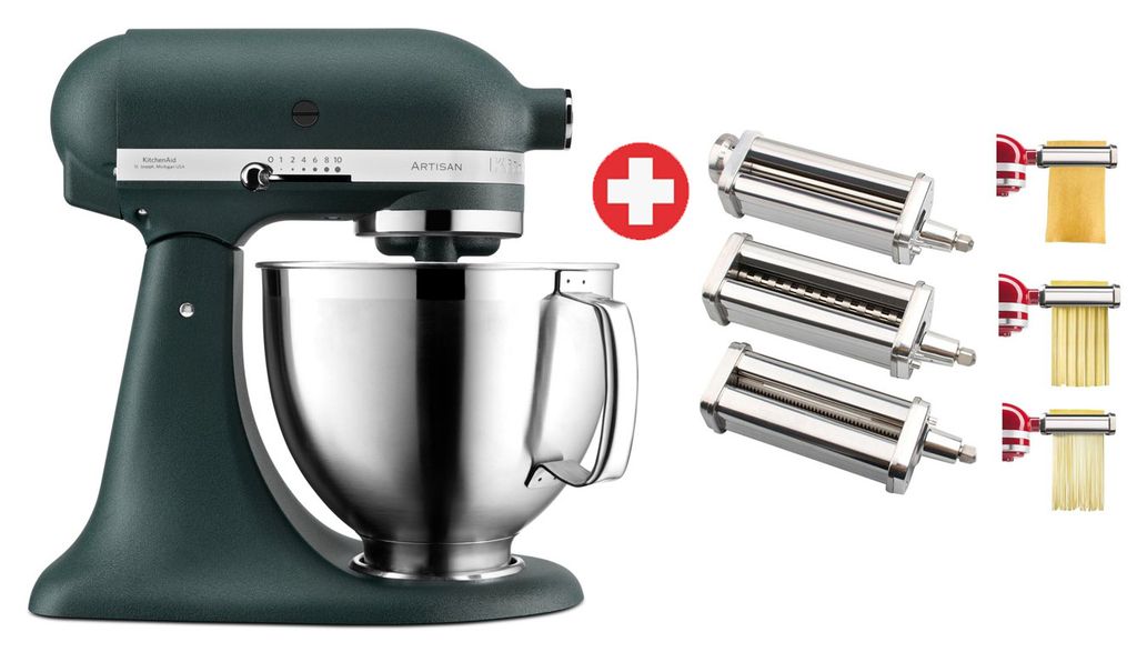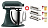 В комплекте венчик, лопатка, крюк, чаша 4.83 л с матовым покрытием, чаша без ручки 3 л и защитный обод.