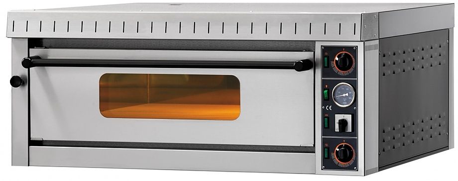 Печь для пиццы GAM MD 4 используется на предприятиях общественного питания, в кондитерских, пекарнях, супер- и гипермаркетах с собственной кухней для выпечки пиццы и хлебобулочных изделий, требующих высокой температуры приготовления. Корпус и камера выполнены из нержавеющей стали, дверца - из керамического стекла, под - из огнеупорного камня.