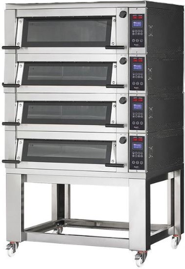 Печь подовая Apach Bakery Line E4LK3S DPBI-T серии E используется на предприятиях общественного питания, торговли, пищевых производствах, в пекарнях и кондитерских для приготовления различных блюд, выпечки хлебобулочных и кондитерских изделий. Модель оборудована цифровым управлением с раздельным контролем температур: верх/низ, независимым парогенератором на каждый под, соединительным комплектом для воды и электричества, дверьми со смотровым окном и подставкой на колесах. Материал подставки и корпуса - высококачественная нержавеющая сталь, материал основания - цементный агломерат с металлическим каркасом, материал теплоизоляции - минеральная вата.