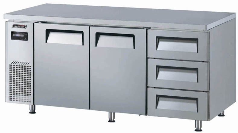 Холодильный стол Turbo air KUR18-3D-3 предназначен для раскатки теста, обработки, охлаждения и кратковременного хранения продуктов и напитков на предприятиях общественного питания и торговли. Корпус выполнен из нержавеющей стали (гальванизированная сталь на оборотной стороне и внизу) с применением пожаробезопасных стенок толщиной 60 мм, уплотнения - из АБС-пластика (акрилонитрилбутадиенстирола), не пропускающего конденсата, пол - из нержавеющей стали с алюминиевыми вставками по бокам и сзади оборудования, тройные направляющие - из высококачественной нержавеющей стали.