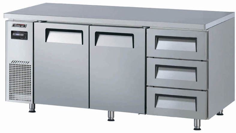 Холодильный стол Turbo air KUR18-3D-3 предназначен для раскатки теста, обработки, охлаждения и кратковременного хранения продуктов и напитков на предприятиях общественного питания и торговли. Корпус выполнен из нержавеющей стали (гальванизированная сталь на оборотной стороне и внизу) с применением пожаробезопасных стенок толщиной 60 мм, уплотнения - из АБС-пластика (акрилонитрилбутадиенстирола), не пропускающего конденсата, пол - из нержавеющей стали с алюминиевыми вставками по бокам и сзади оборудования, тройные направляющие - из высококачественной нержавеющей стали.