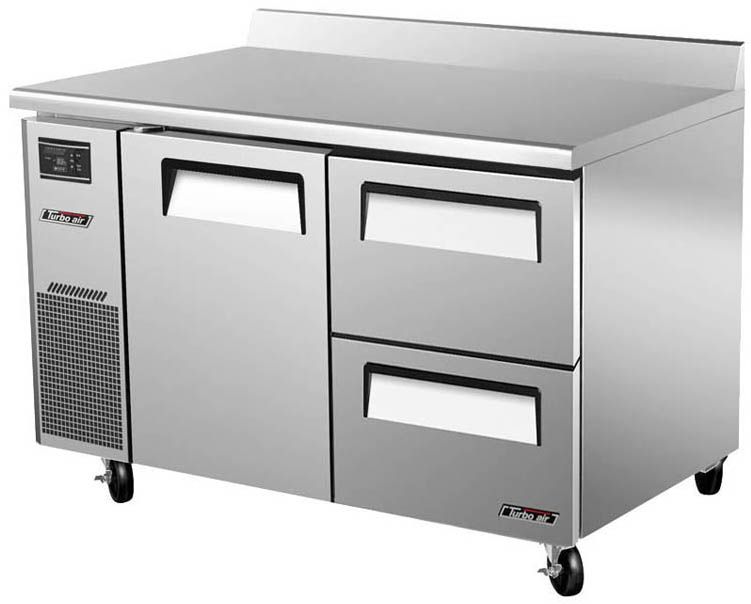 Холодильный стол Turbo air KWR12-2D-2 предназначен для раскатки теста, обработки, охлаждения и кратковременного хранения продуктов и напитков на предприятиях общественного питания и торговли. Корпус выполнен из нержавеющей стали (гальванизированная сталь на оборотной стороне и внизу) с применением пожаробезопасных стенок толщиной 60 мм, уплотнения - из АБС-пластика (акрилонитрилбутадиенстирола), не пропускающего конденсата, пол - из нержавеющей стали с алюминиевыми вставками по бокам и сзади оборудования, тройные направляющие - из высококачественной нержавеющей стали.
