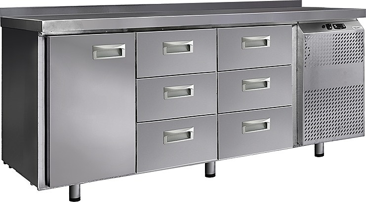 Холодильный стол Finist СХС-600-1/6 используется на предприятиях общественного питания, торговли и пищевых производствах для хранения и обработки полуфабрикатов из мяса и рыбы, заготовок для салата, охлажденных напитков и прочих пищевых продуктов. Управление при помощи кнопочной панели управления, оснащенной цифровым дисплеем. Холодильная камера с распашными дверцами, 6 выдвижных ящиков, агрегатный отсек располагается сбоку. Стол установлен на ножки с подпятниками. Материал корпуса - нержавеющая сталь.