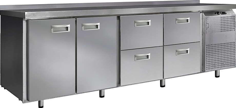 Холодильный стол Finist СХС-600-2/4 используется на предприятиях общественного питания, торговли и пищевых производствах для хранения и обработки полуфабрикатов из мяса и рыбы, заготовок для салата, охлажденных напитков и прочих пищевых продуктов. Управление при помощи кнопочной панели управления, оснащенной цифровым дисплеем. 2 холодильные камеры с распашными дверцами, 4 выдвижных ящика, агрегатный отсек располагается сбоку. Стол установлен на ножки с подпятниками. Материал корпуса - нержавеющая сталь.