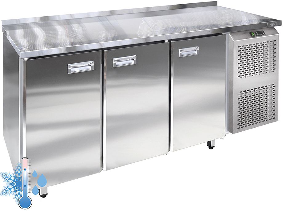 Холодильный стол Finist УХС-600-3 используется на предприятиях общественного питания, торговли и пищевых производствах для хранения и обработки полуфабрикатов из мяса и рыбы, заготовок для салата, охлажденных напитков и прочих пищевых продуктов. Управление при помощи кнопочной панели управления, оснащенной цифровым дисплеем. 3 холодильные камеры с распашными дверцами, агрегатный отсек располагается сбоку. Стол установлен на ножки с подпятниками. Материал корпуса - нержавеющая сталь.