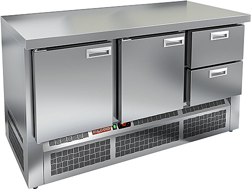 Холодильный стол HICOLD SNE 112/TN O используется на предприятиях общественного питания, торговли и пищевых производствах для обработки различных ингредиентов и хранения продуктов, напитков и кухонных принадлежностей. Модель оснащена электронной панелью управления, динамической системой охлаждения, автоматической оттайкой, доводчиком дверей с фиксатором, глухими дверцами, ящиками и регулируемыми ножками. Материал корпуса и столешницы - высококачественная нержавеющая сталь.