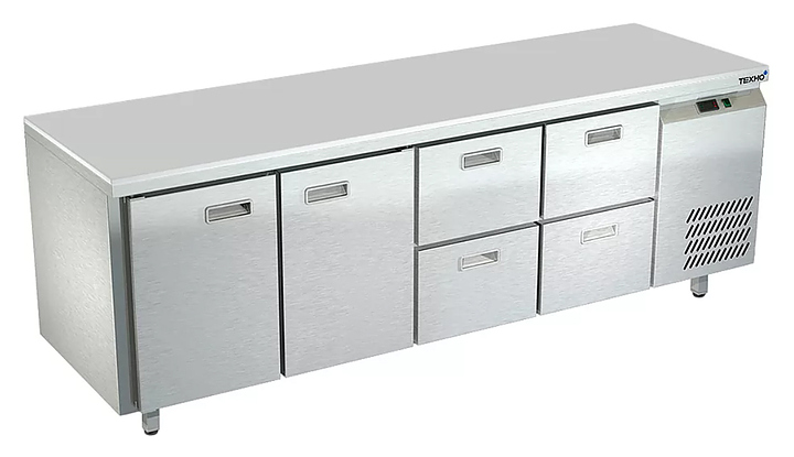 Холодильный стол Техно-ТТ СПБ/О-522/24-2207 предназначается для раскатки теста, обработки, охлаждения и кратковременного хранения продуктов и напитков на предприятиях общественного питания, торговли и пищевых производствах. Секции оснащены направляющими и ящиками с доводчиками. Материал корпуса - нержавеющая сталь AISI 430, материал столешницы - полипропилен (толщина 20 мм), материал задней панели и дна - оцинкованная сталь.