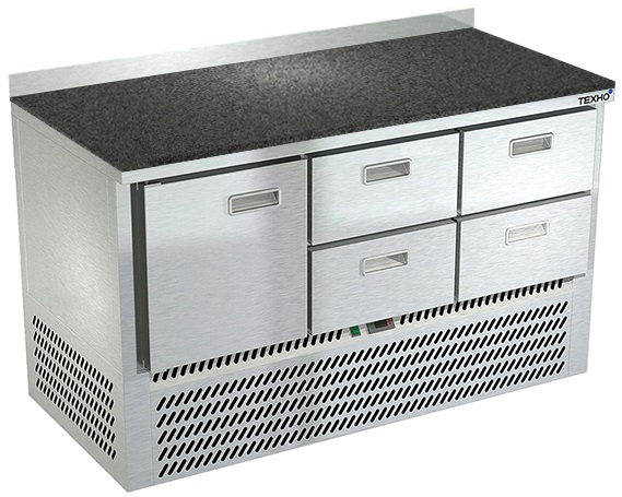 Холодильный стол Техно-ТТ СПН/О-422/14-1406 предназначается для раскатки теста, обработки, охлаждения и кратковременного хранения продуктов и напитков на предприятиях общественного питания, торговли и пищевых производствах. Секции оснащены направляющими и ящиками с доводчиками. Материал корпуса - нержавеющая сталь AISI 430, материал столешницы - гранит (толщина 20 мм), материал задней панели и дна - оцинкованная сталь.