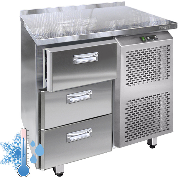 Холодильный стол Finist УХС-600-0/3 используется на предприятиях общественного питания, торговли и пищевых производствах для хранения и обработки полуфабрикатов из мяса и рыбы, заготовок для салата, охлажденных напитков и прочих пищевых продуктов. Управление при помощи кнопочной панели управления, оснащенной цифровым дисплеем. 1 секция с 3 выдвижными ящиками с доводчиками, агрегатный отсек располагается сбоку. Стол установлен на ножки с подпятниками. Материал корпуса - нержавеющая сталь.