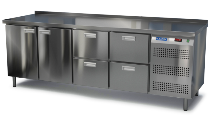 Холодильный стол КАМИК СО-Т-24237 используется на предприятиях общественного питания и торговли для охлаждения и хранения продуктов, напитков и готовых блюд, а также для установки теплового оборудования на него. Конструкция разделена на секции, каждая из которых оборудована сетчатой полкой и парой направляющих. Корпус выполнен из нержавеющей стали.