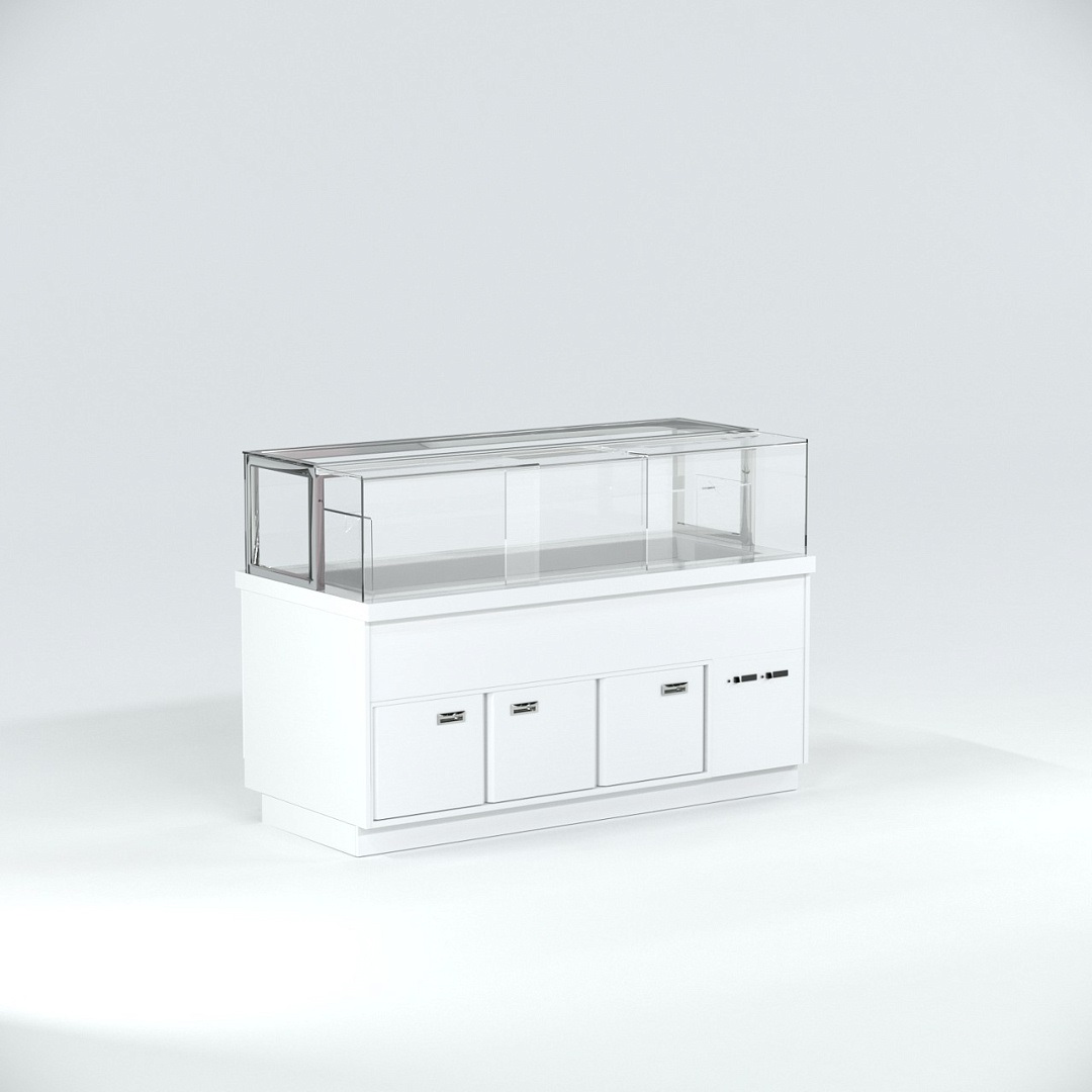 Витрина кондитерская Finist Maria Ms-19-9 используется для демонстрационной выкладки, охлаждения и хранения кондитерских и хлебобулочных изделий на предприятиях общественного питания и торговли. Модель оснащена микропроцессорным блоком, автоматической оттайкой, выдвижной полкой, подсветкой и дверьми-купе. Материал фронтальных и боковых панелей облицовки - МДФ панели, материал купола и полок - просветленное стекло, материал зоны выкладки и столешницы - искусственный камень.
