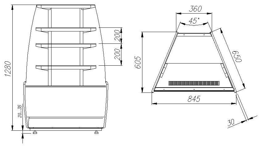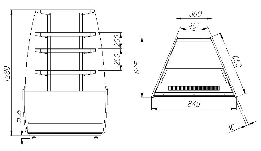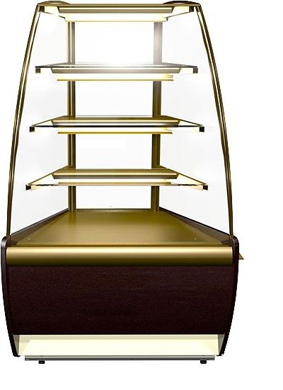 Угловая кондитерская витрина Carboma K70 VM-3 (ВХСв - У1д) используется на предприятиях общественного питания и торговли для демонстрации, охлаждения и кратковременного хранения тортов, пирожных и других кондитерских изделий. Модель оснащена изогнутым фронтальным и 3-мя прямыми стеклами, охлаждаемой фиксированной полкой и регулируемыми ножками высотой от 20 до 35 мм. Основание и декоративные панели выполнены из стали, боковины - из пластика с пенополиуретановой теплоизоляцией, раздвижные задние створки - из оргстекла.