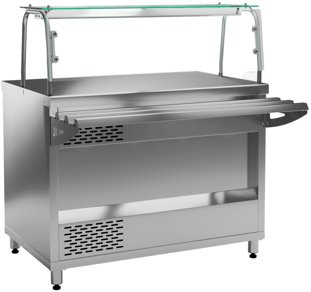 Прилавок-витрина Марихолодмаш ПМПЭ11 используется в составе линии раздачи Шеф 1120 на предприятиях общественного питания, торговли и пищевых производствах для демонстрационной выкладки и кратковременного хранения первых блюд, хлебобулочных и кондитерских изделий, напитков и посуды. Прилавок оснащен охлаждаемой столешницей, полкой и диодным освещением. Материал корпуса - высококачественная нержавеющая сталь.