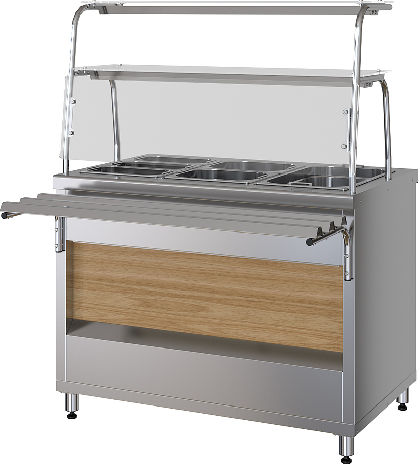 Прилавок-мармит Марихолодмаш ПМВЭ11 используется в составе линии раздачи Шеф 1120 на предприятиях общественного питания, торговли и пищевых производствах для подогрева, демонстрационной выкладки и кратковременного хранения вторых блюд, хлебобулочных и кондитерских изделий, напитков и посуды. Прилавок оснащен конфоркой, полкой, диодной подсветкой и защитным экраном. Материал корпуса - высококачественная нержавеющая сталь.
