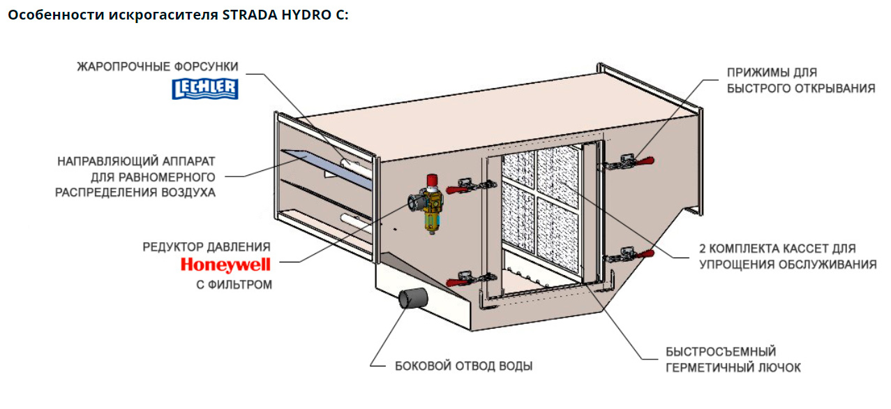 Искрогаситель STRADA HYDRO C 5,0 предназначен для гашения искр пламени от мангалов, грилей и угольных печей на предприятиях общественного питания и торговли. Модель оснащена 5 жаропрочными форсунками с улучшенными характеристиками для максимального гашения искр, многослойной сетчатой кассетой из гофрированных нержавеющих сеток разного диаметра, съемной каплеулавливающей кассетой и быстросъемным герметичным люком. Корпус выполнен из нержавеющей стали AISI 430, фильтрующие кассеты - из жаропрочных коррозионностойких материалов.