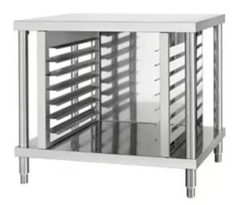 Стенд используется в качестве подставки для пароконвектоматов и служит для хранения готовых изделий или полуфабрикатов в противнях и гастроемкостях на предприятиях пищевой промышленности, общественного питания и торговли. Модель оснащена регулируемыми по высоте ножками. Корпус выполнен из нержавеющей стали AISI 430.