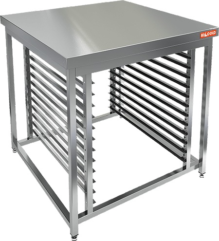 Подставка HICOLD НППК-9/9/9 из нержавеющей стали AISI 430 оснащена направляющими для противней, используется как вспомогательное оборудование под пароконвектомат на профессиональных кухнях.