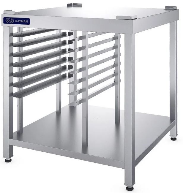 Подставка под пароконвектомат KAYMAN ПКУ-960/0808 А используется на предприятиях общественного питания, торговли и пищевых производствах для установки электрического пароконвектомата ПКЭ-6-И А. Модель оснащена полкой, столешницей и регулируемыми ножками. Материал столешницы, направляющих и полки - высококачественная нержавеющая сталь AISI 304, материал стоек - высококачественная нержавеющая сталь AISI 201 (труба 40х40 мм).