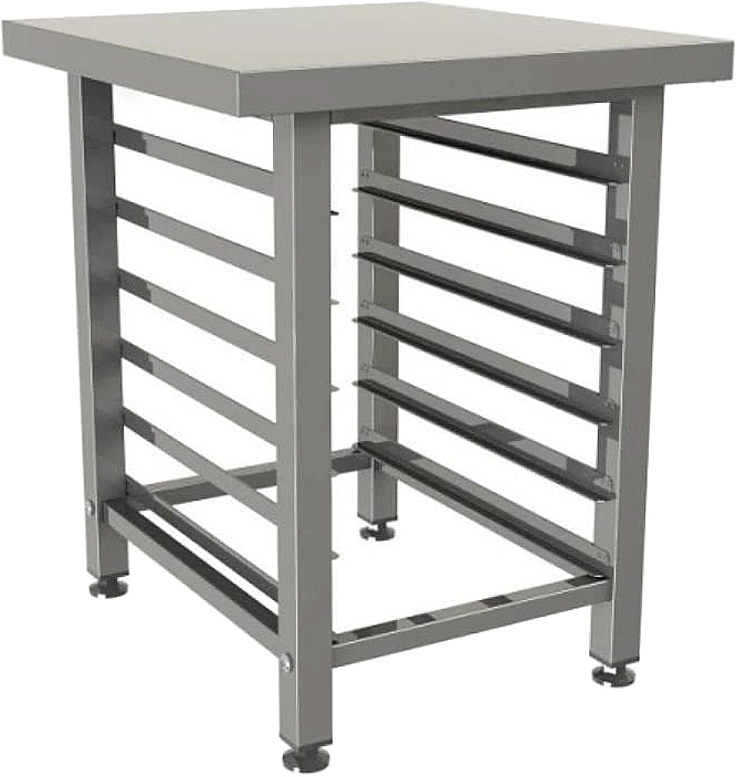 Подставка Restoinox ПКПР-1-75/67 предназначается для установки конвекционных печей Radax GOGOL GG43 на предприятиях общественного питания, торговли и пищевых производствах. Опоры ножек регулируются по высоте. Материал разборного каркаса - труба из нержавеющей стали AISI 430 (40x40 мм), материал столешницы и направляющих - нержавеющая сталь AISI 430.