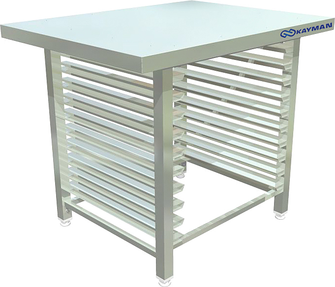 Подставка KAYMAN ПКУ используется на предприятиях общественного питания и торговли совместно с пароконвектоматами Apach, Rational, Abat, Unox и ATESY для хранения гастроемкостей и противней. Каркас выполнен из нержавеющей трубы AISI 430, столешница - из нержавеющей стали AISI 430.