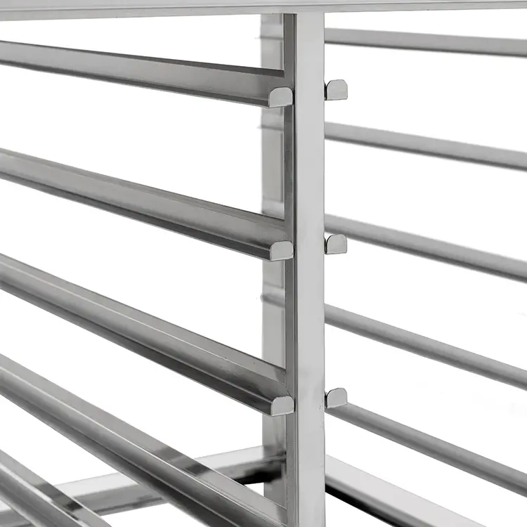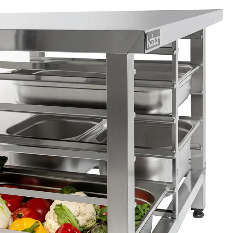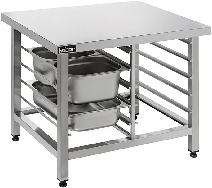 Подставка изготовлена из высококачественной стали. Изделие имеет направляющие, позволяющие разместить в них гастроемкости либо противни, в зависимости от модели подставки. Каркас произведен из нержавеющей квадратной трубы 40х40 мм. Ножки регулируются по высоте, что позволяет исправить неровности пола.