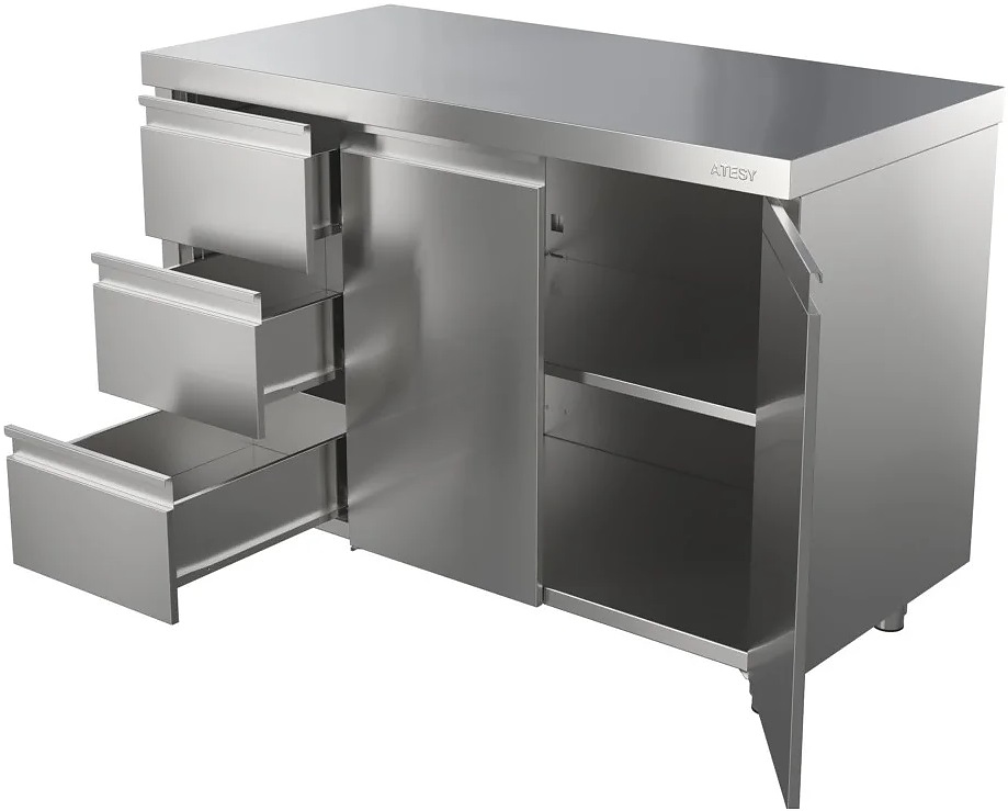 Производственный стол ATESY СТ-С-1100.600-02-Р-3Л используется на предприятиях общественного питания, торговли и пищевых производствах для раскатки теста, приготовления различных блюд и хранения кухонных принадлежностей. Материал столешницы, двери и боковых панелей - нержавеющая сталь AISI 430, материал дна и задней стенки - оцинкованная сталь, материал ножек - нержавеющая сталь с пластиковой опорной частью. Столешница укреплена листом ЛДСП толщиной 16 мм.
