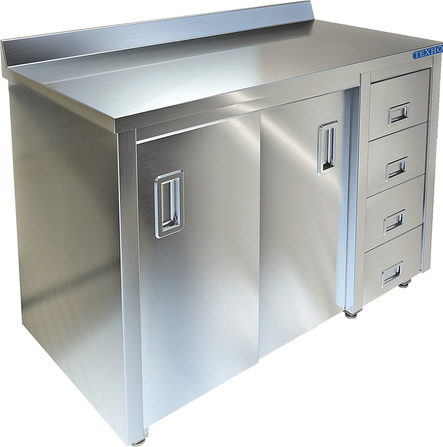 Производственный стол-тумба Техно-ТТ СПС-226/1400-П предназначен для разделки и обработки пищевых продуктов, а также для расстановки и хранения посуды и кухонного инвентаря на предприятиях общественного питания, торговли и пищевых производствах. Стол оснащен бортом, 2 дверьми-купе и 4 выдвижными ящиками. Материал корпуса - нержавеющая сталь AISI 430, материал столешницы - нержавеющая сталь AISI 304, материал задней стенки - оцинкованная сталь.