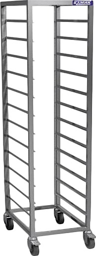 Тележка-шпилька КАМИК Шп-4814661пр используется на предприятиях общественного питания и торговли для временного хранения и транспортировки полуфабрикатов и готовой продукции, а также в процессе работы с пекарскими и расстоечными шкафами. Модель оснащена 4 прорезиненными поворотными колесами, 2 из которых оборудованы тормозами. Конструкция выполнена из нержавеющей стали AISI 430.