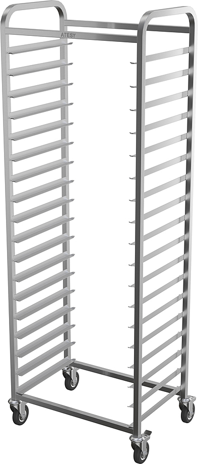 Тележка-шпилька ATESY КШ-С-1.18-600.400-02 серии Стандарт предназначается для временного хранения и перемещения гастроемкостей между линиями раздачи готовых блюд и кухней на предприятиях общественного питания, торговли и пищевых производствах. Тележка оснащена 4 поворотными колесами (2 с тормозами), кромками с безопасным подгибом. Тип конструкции - сварная, стойки из труб квадратного сечения. Материал конструкции - нержавеющая сталь AISI 304.