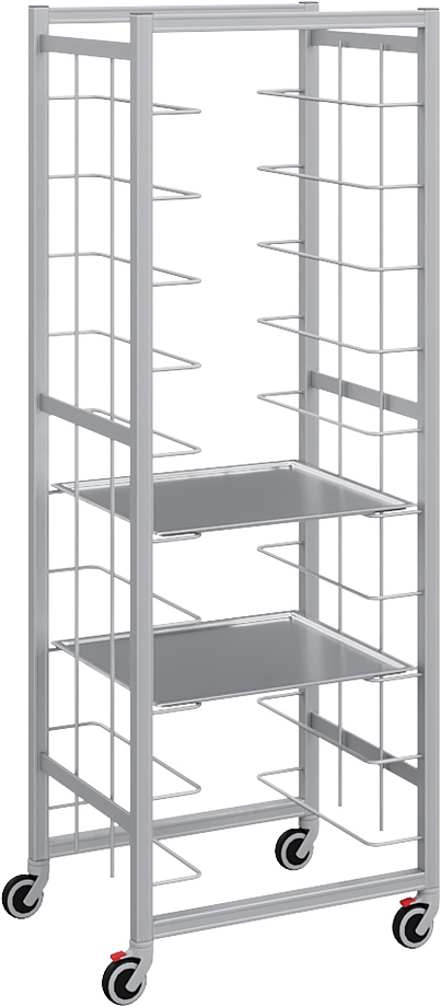Тележка-шпилька POLAIR LOAD.ME.KITCHEN KG16.09.57.40 используется на предприятиях общественного питания, торговли и пищевых для хранения и транспортировки подносов. Модель оснащена поворотными колесиками и стопорами. Материал рамы - анодированный алюминий, материал направляющих - высококачественная нержавеющая сталь.
