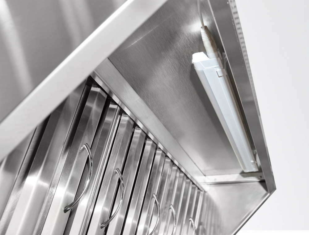 Вытяжной зонт с пароконденсатором Abat ЗВВ-800П предназначен для очистки воздуха от аэрозолей жира, масла и производственных запахов в закрытых помещениях на предприятиях общественного питания и торговли. Модель оснащена верхней панелью управления, подсветкой, всасывающим вентилятором, 3 лабиринтными фильтрами и 2 сменными угольными фильтрами. Каркас выполнен из нержавеющей стали AISI 304.