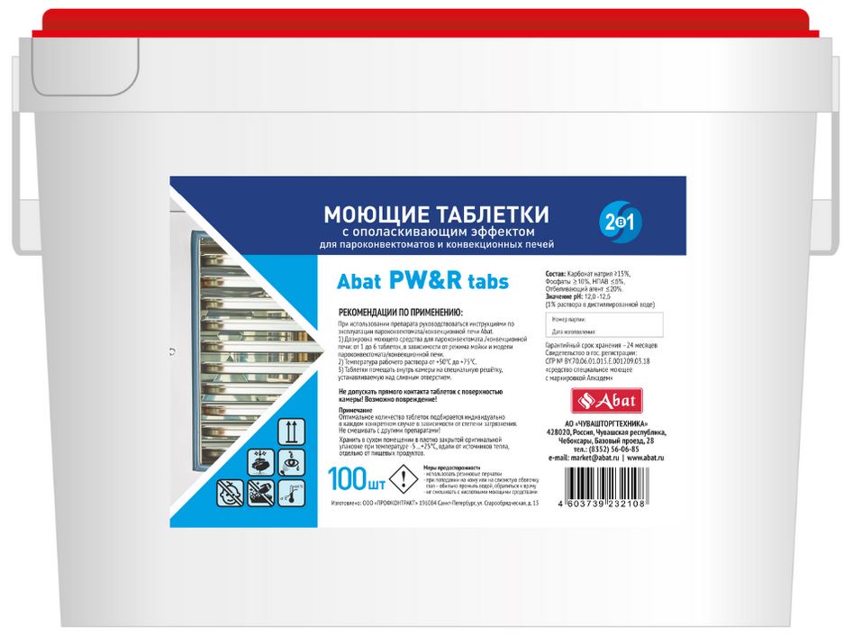 Моющие таблетки 2 в 1 Abat PW&R tabs (100 шт) с ополаскивающим эффектом используется на предприятиях общественного питания, торговли и пищевых производствах для обработки и очистки пароконвектоматов и конвекционных печей с функцией мойки таблеткой.