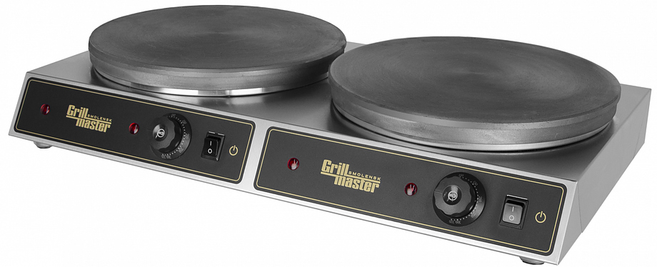 Блинница Grill Master Ф2БкрЭ 400 мм используется на предприятиях общественного питания, торговли и пищевых производствах для выпекания блинов. 2 рабочие поверхности (d = 400 мм), 2 ТЭНа специальной формы для раномерного нагрева поверхности. Регулировка температуры с помощью теплоизолированного термостата. Материал корпуса - нержавеющая сталь.