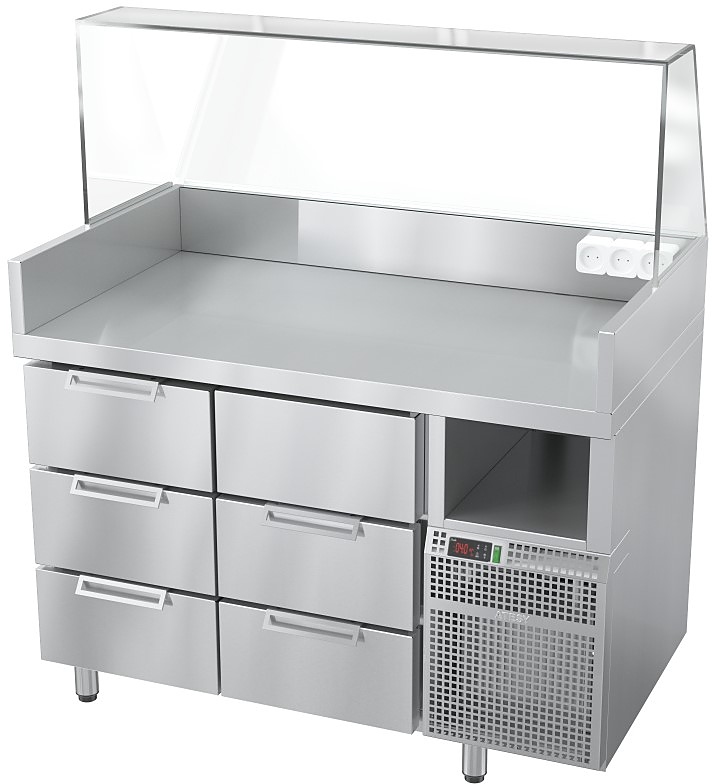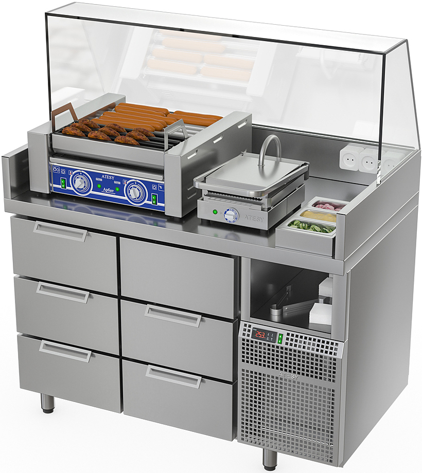 Станция для бургеров и хот-догов ATESY Бавария БХС-1235.700-02-2 используется на предприятиях общественного питания, торговли и пищевых для производствах с целью комплексного оснащения места для приготовления и продажи хот-догов и бургеров, а также хранения охлажденных полуфабрикатов, начинок, соусов и хлебобулочных изделий. Нейтральная ниша для хранения инвентаря и посуды, охлаждаемые гастронормированные ящики (GN 1/1, GN1/2, максимально допустимая глубина устанавливаемых гастроемкостей - 150 мм), температурный режим станции регулируется с помощью встроенного контроллера (есть возможность программирования). Материал станции - нержавеющая сталь.