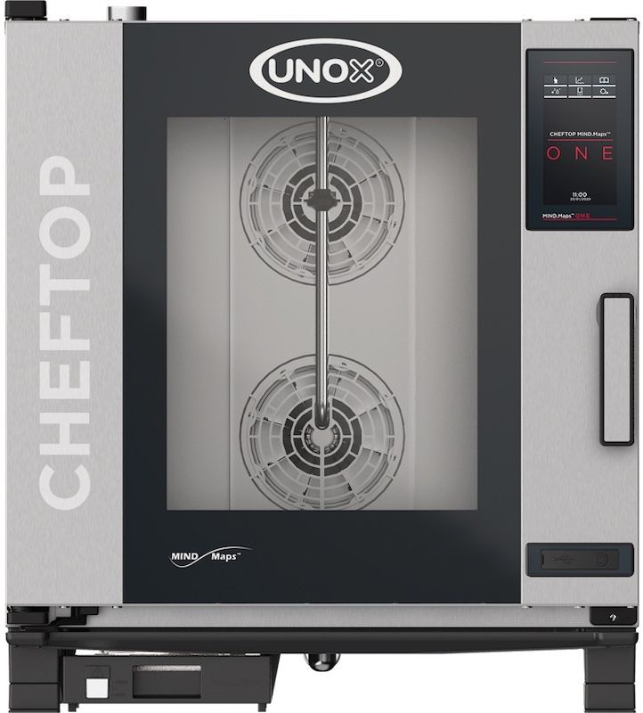 Пароконвектомат UNOX XEVC-0711-E1RM серии CHEFTOP MIND.Maps™ ONE предназначен для приготовления различных блюд, выпечки хлебобулочных и кондитерских изделий на предприятиях общественного питания и торговли, в пекарнях и кондитерских. Модель оснащена встроенной в дверь светодиодной LED-подсветкой и C-образными с зубчатыми нишами направляющими. Внутреннее открывающееся стекло облегчает чистку и обеспечивает максимальную гигиену. Камера с закругленными углами выполнена из нержавеющей стали AISI 304, направляющие - из профилированной стали, дверной замок - из высокопрочного самосмазывающегося технополимера, внутренний штифт дверной ручки - из углеродного волокна.