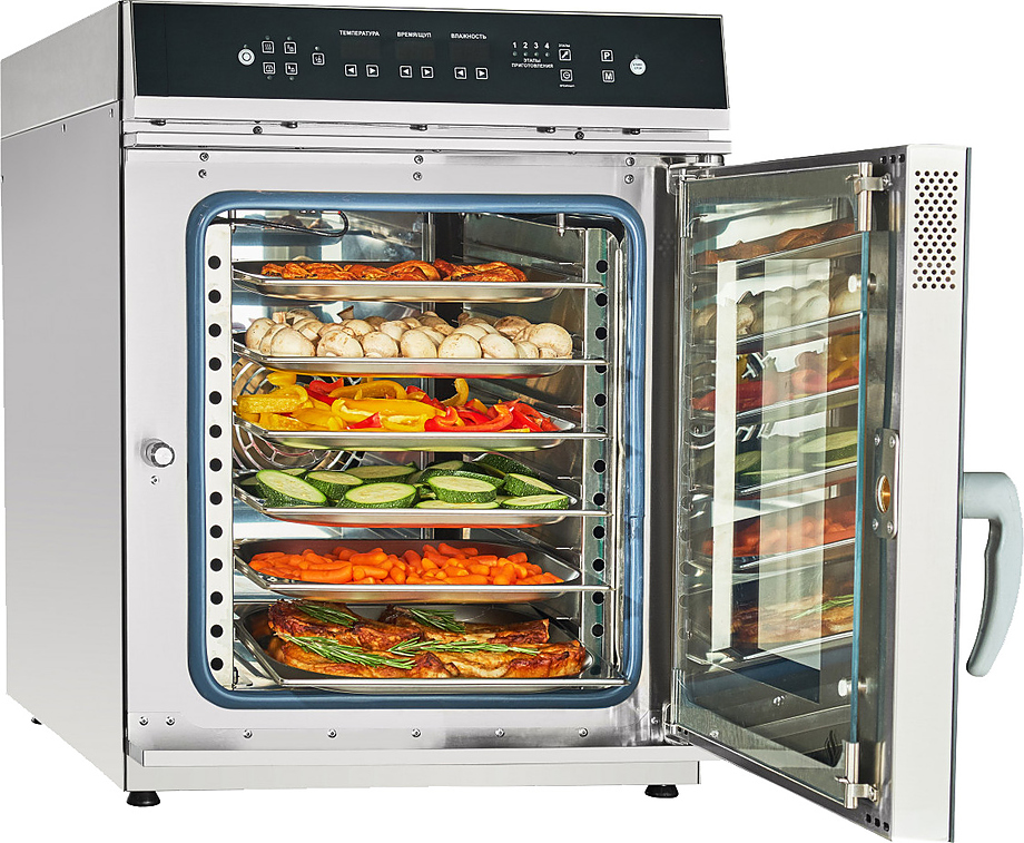 Благодаря небольшим габаритным размерам пароконвектомат подходит для помещений с ограниченным пространством и размещается на столе или подставке.