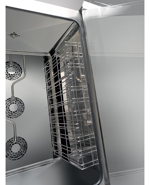 Улучшенная панель управления прибора позволяет легко осуществлять регулировку температуры, времени готовки и периодичности вспрыска. Пароконвектомат предлагает несколько вариантов климата работы внутренней камеры: от «сухого» жара до режима максимальной влажности и наоборот. Внутренняя подсветка и широкое двойное термостойкое стекло в распашной двери позволяют наблюдать за процессом приготовления блюда без необходимости открытия дверцы.