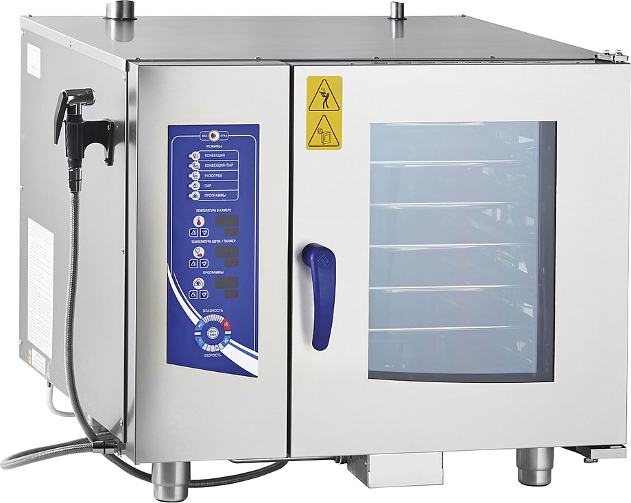 Пароконвектомат Abat ПКА 6-1/1ПМ2-01 предназначен для обжаривания, приготовления на пару, бланширования, запекания и других видов тепловой обработки продуктов на предприятиях общественного питания и торговли. Оборудование заменяет сразу несколько видов приборов: плиту, конвекционную печь, жарочный шкаф, духовку, опрокидывающуюся сковороду, пищеварочный котел, фритюрницу и др. Приготовленные в пароконвектомате блюда сохраняют все полезные вещества. Модель оснащена подсветкой, легкосъемным жировым фильтром, душем для мойки и дверью с двойным остеклением.
