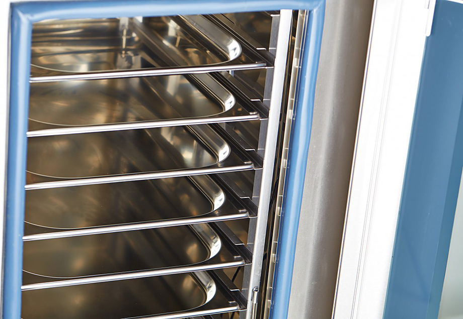- Двухходовой механизм открывания двери для защиты персонала от горячего пара
