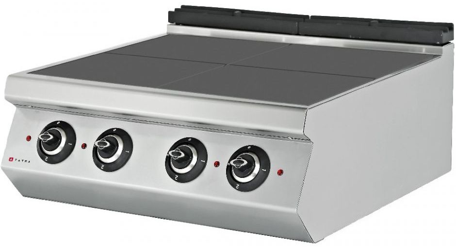 Электрическая плита Tatra TER.87 700 серии предназначена для жарки мяса, птицы, рыбы, овощей и быстрого разогрева полуфабрикатов на предприятиях общественного питания и торговли. Модель оснащена электромеханической панелью управления, 4 низкими чугунными конфорками и регулируемыми ножками. Корпус выполнен из нержавеющей стали.