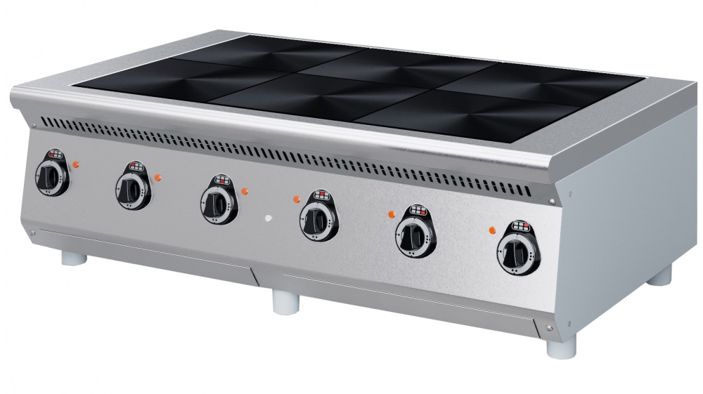 Электрическая плита KAYMAN ПЭ-6-12-МХ используется на предприятиях общественного питания, торговли и пищевых производствах для приготовления блюд в наплитной посуде. 6 терморегуляторов на передней панели. Плита оснащена воздуховодом. Материал корпуса - нержавеющая сталь.