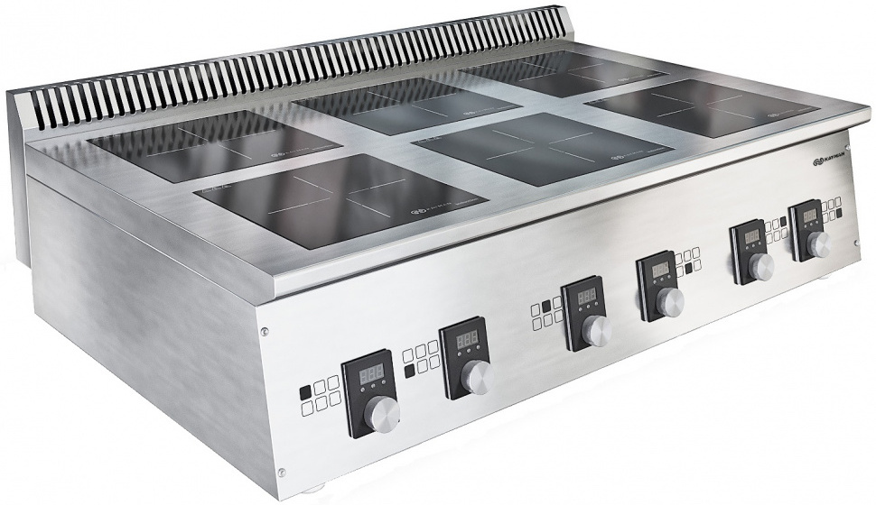 Плита индукционная  KAYMAN ПИ-6-12 используется на предприятиях общественного питания, торговли и пищевых производствах для приготовления блюд в наплитной посуде. Конструкция с бортом. 9 уровней мощности, защита от использования неиндукционной посуды. Плита поставляется в собранном виде. Материал корпуса - нержавеющая сталь AISI 430, материал столешницы - нержавеющая сталь AISI 304.