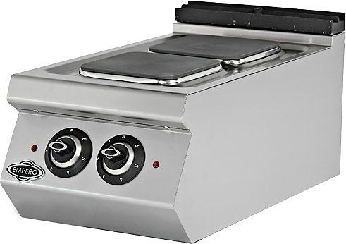 Плита электрическая EMP.PLS.7KE010 предназначается для приготовления блюд широкого спектра в наплитной посуде на предприятиях общественного питания, торговли и пищевых производствах. Плита оснащена 2 терморегуляторами, 6 положений у каждого, а также легка в очистке. Материал корпуса - нержавеющая сталь.