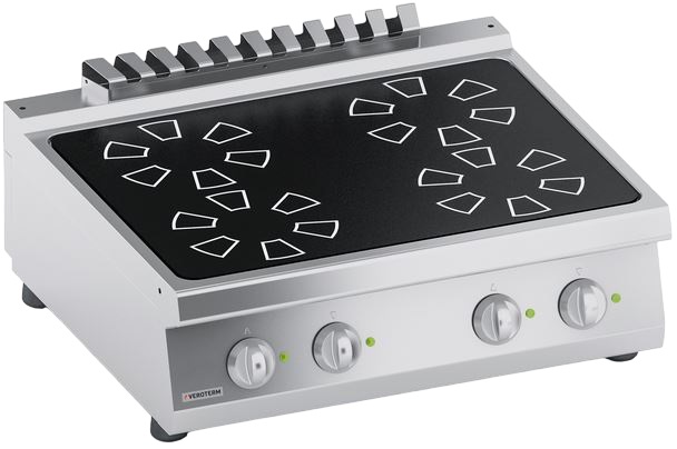 Индукционная плита Veroterm VT7CIE10TT серии 700 используется на предприятиях общественного питания, торговли и пищевых производствах для приготовления различных блюд в наплитной посуде. Модель оснащена механическим управлением, индикаторам и регуляторами температуры. Материал изделия - высококачественная нержавеющая сталь AISI 430 (толщина 1 мм), материал конфорок - Швейцарская стеклокерамика (толщина 6 мм).