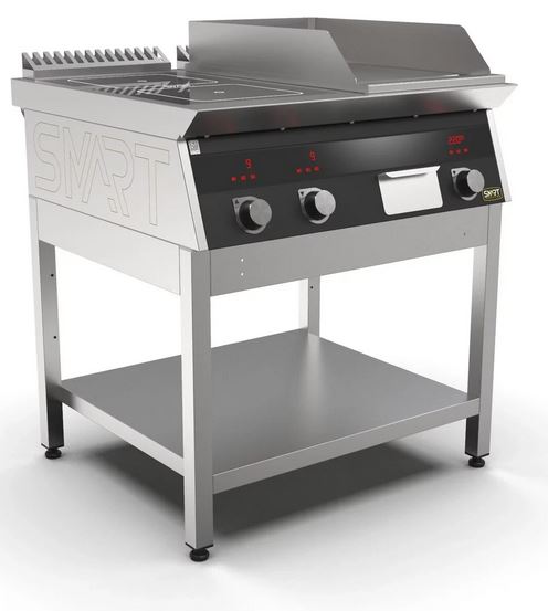 Индукционная плита SMART INDUCTION K94-3KPB (с грилем) серии 900 используется на предприятиях общественного питания, торговли и пищевых производствах для приготовления и разогрева различных видов блюд в специализированной посуде. Модель оснащена электро-механическим управлением и сенсорными кнопками, индикаторами, 2 жировым фильтрами съемными, ящиком для масла, жира и остатков пищи и регулируемыми ножками. Материал корпуса и столешницы - высококачественная нержавеющая сталь AISI 430, материал рабочей поверхности - стеклокерамика, материал рабочей поверхности гриля - нержавеющая сталь, материал передней панели - стойкое полимерное покрытие черного цвета.