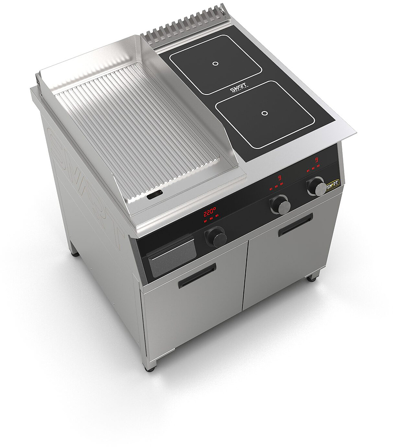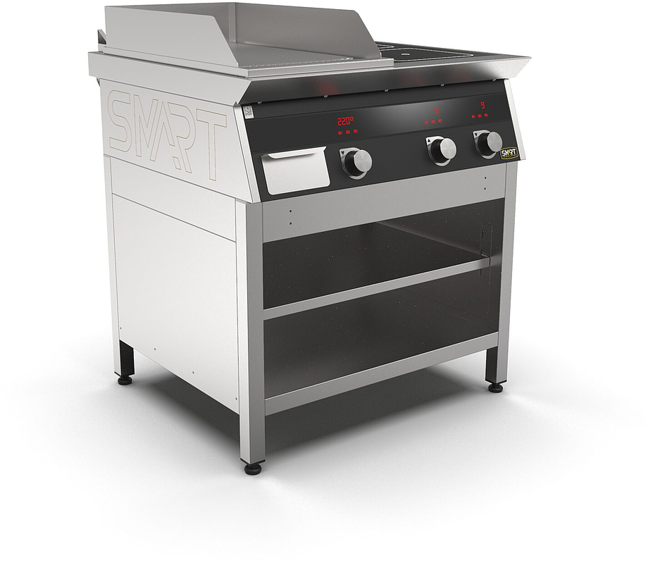 Индукционная плита SMART INDUCTION K74-35RKB (с грилем) серии 700 используется на предприятиях общественного питания, торговли и пищевых производствах для приготовления и разогрева различных видов блюд в специализированной посуде. Модель оснащена электро-механическим управлением и сенсорными кнопками, индикаторами, 2 жировым фильтрами съемными, ящиком для масла, жира и остатков пищи и регулируемыми ножками. Материал корпуса и столешницы - высококачественная нержавеющая сталь AISI 430, материал рабочей поверхности - стеклокерамика, материал рабочей поверхности гриля - нержавеющая сталь, материал передней панели - стойкое полимерное покрытие черного цвета.