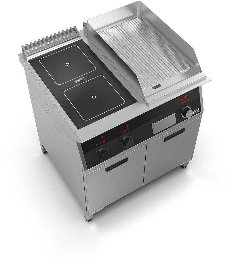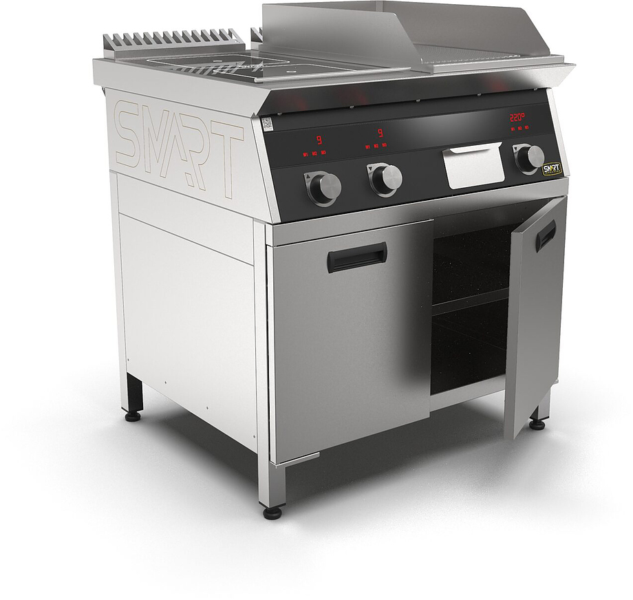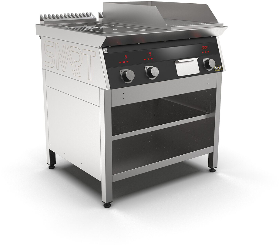 Индукционная плита SMART INDUCTION K94-3KRB (с грилем) серии 900 используется на предприятиях общественного питания, торговли и пищевых производствах для приготовления и разогрева различных видов блюд в специализированной посуде. Модель оснащена электро-механическим управлением и сенсорными кнопками, индикаторами, 2 жировым фильтрами съемными, ящиком для масла, жира и остатков пищи и регулируемыми ножками. Материал корпуса и столешницы - высококачественная нержавеющая сталь AISI 430, материал рабочей поверхности - стеклокерамика, материал рабочей поверхности гриля - нержавеющая сталь, материал передней панели - стойкое полимерное покрытие черного цвета.